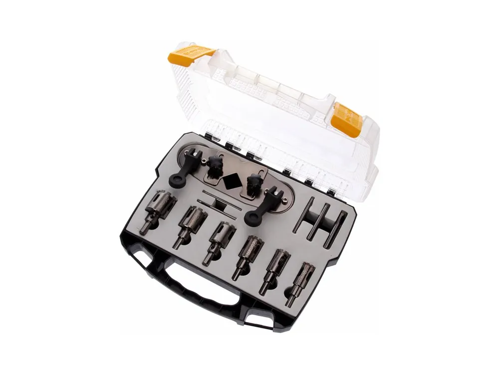 Setul profesional de carote diamantate E05 este destinat găuririi faianței, gresiei, ceramicii, sticlei, granitului, marmurei și pietrei artificiale. Datorită stratului diamantat de înaltă calitate, burghiele oferă o tăiere curată și precisă, fără fisuri sau ciobiri. Setul include și un șablon de ghidaj care facilitează alinierea exactă. Totul este organizat într-o valiză rezistentă din plastic cu mâner, pentru transport ușor și protecția sculelor.