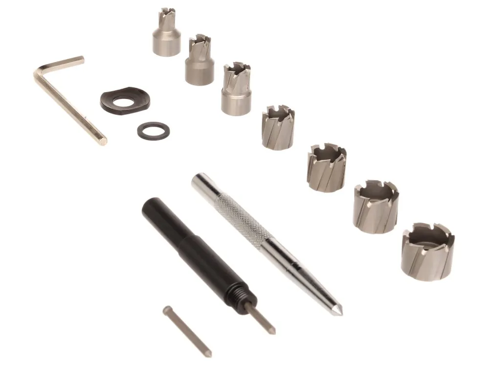 Ghidajul de foraj garantează găuri precise, potrivite pentru găurirea în țevi din tablă și metal și plastic atunci când se utilizează atât burghie manuale, cât și burghie de banc. Coroanele interschimbabile pentru gamba inclusă au diametre de 8, 10, 12, 14, 16, 18 și 20 mm. Setul este completat de o priză pentru marcarea centrelor găurilor și de o cheie allen.