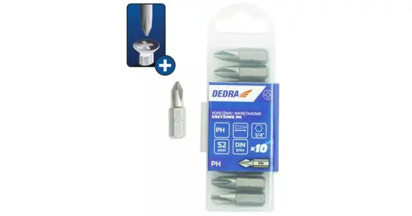 10 bucati, cutie de plastic CARACTERISTICI: Tip: Biti, bucati de surubelnita Serie: DEDRA Numarul este inclus: 10 Tip maner: HEX Tip de bacsis: Philips (PH) Lungime bit [mm]: 25