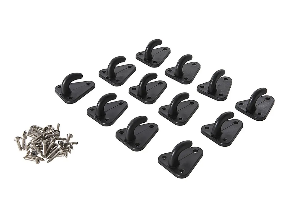Cârlige din plastic puternice, durabile, cu găuri pentru înșurubare sau nituire. Ideal pentru remorci, rafturi de acoperiș, bărci, rulote și alte vehicule. Pentru fixarea plaselor, velelor, capacelor, frânghiilor și gumolanului. Dimensiuni cârlig: (L x L x H): 43 x 37 x 25 mm. Diametrul orificiului de fixare de 4,8 mm. Șuruburile autofiletante din oțel inoxidabil de 3,5 x 17 mm sunt incluse în pachet.