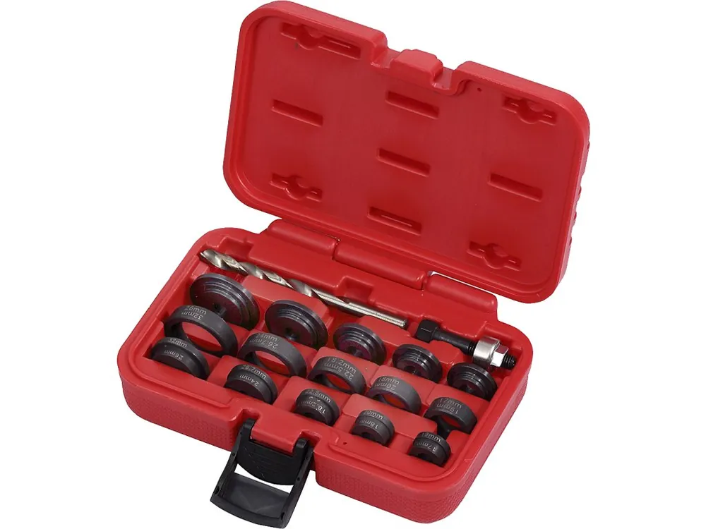 Permite aşchierea rapidă şi uşoară a găurilor de dimensiuni adecvate în barele de protecţie din plastic pentru instalarea unui senzor de control al distanţei la parcare sau a unei camere. Diametre de freze 17 mm; 18 mm; 18,2 mm; 19 mm; 20 mm; 22,5 mm; 24 mm; 26 mm; 26,7 mm şi 32 mm. Furnizat, inclusiv un burghiu de 5 mm pentru pre-găurire, toate într-o geantă din plastic.