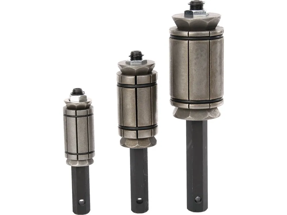 Set de dispozitive pentru lărgirea capetelor țevilor de eșapament în intervalul: A 29 – 44 mm, B 38 – 64 mm, C 54 – 89 mm. Coada cilindrică permite utilizarea cu cheile tubulare standard, A+B=16 mm, C=19 mm.