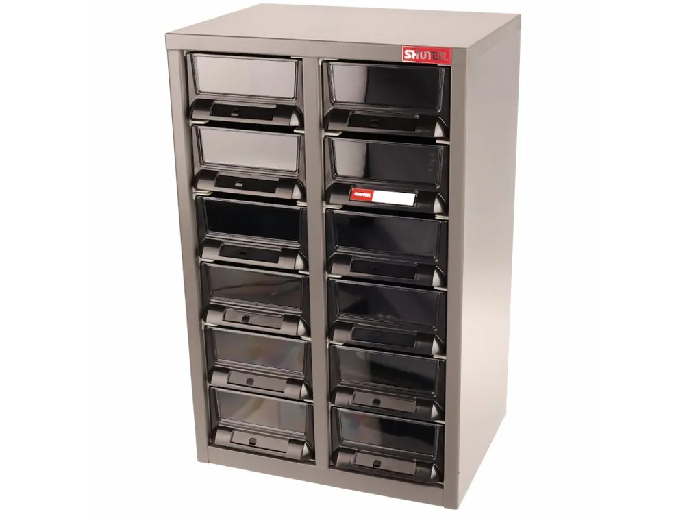 Un dulăpior metalic solid de 362 × 265 × 571 mm cu 12 sertare din ABS (inclusiv pereţii despărţitori), cu o capacitate portantă de 10 kg şi dimensiuni interioare de 144 × 247 × 75 mm asigură un spaţiu de depozitare ideal pentru elemente de fixare şi alte articole mici.