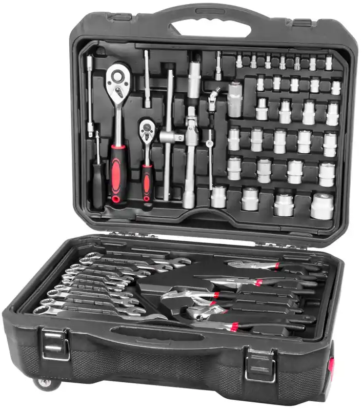 – 1 buc. Cleste 180 mm – 1 buc cheie frantuzeasca 200 mm – 1 buc clește reglabil 250 mm – 1 buc.Cleste pentru inele 180 mm – 1 buc clește combinat 150 mm – 10 buc Cheie cu cap deschis 8-19 mm – 6 buc Micro surubelnite (s/d 1.0, 1.4, 1.8, 2.4 mm; # 0, 1) – 9 buc chei hexagonale 1,5 – 10 mm – 24 de biți (V 3-7; VPH 0-4; VPZ 1-2; VT 10-35; V. 3-8) – 1 șurubelniță pentru bucăți – 1 suport pentru biți – 14 buc Șurubelniță [(-) 3×75, 4×100, 5×75, 6×38, 6×100 mm; (+) 3×75, 4×100, 5x75x 6×38, 6×100, 8×150 mm; Izolat (-) 4×100, 5,5×100 mm; Izolat (+) 4×100 mm] – 1 buc. clichet – 1 șurubelniță magnetică – 1 pc tester – 1 buc Bit – 12 buc 1/4″ Cap 4-13 mm – 17 buc 1/2″ Cap 10-30 mm – 2 buc 1/2″ Cap pentru lumanari 16,21 mm – 2 buc 1/2″, 1/4″ Cardan – 2 buc 1/2″, 1/4″ robinet – 3 buc 1/2×5″, 1/4×2″, 4″ extensie extensie – 1 buc Atașament flexibil 150 mm – 1 buc Extensie 1/4″ pentru cap 150 mm – 2 buc. clichet 1/2″, 1/4″. – 2 buc. cleme din nailon – 60 buc bandă de legare – 1 buc Ciocan de pantof – 1 clește de sertizare – 1 metru – 1 buc Pistol de topire + bastoane de topire – 1 buc Cuțit de tăiat – 1 buc bandă izolatoare – 1 nivela cu bulă de aer din aluminiu – 1 carcasă cu blocare.