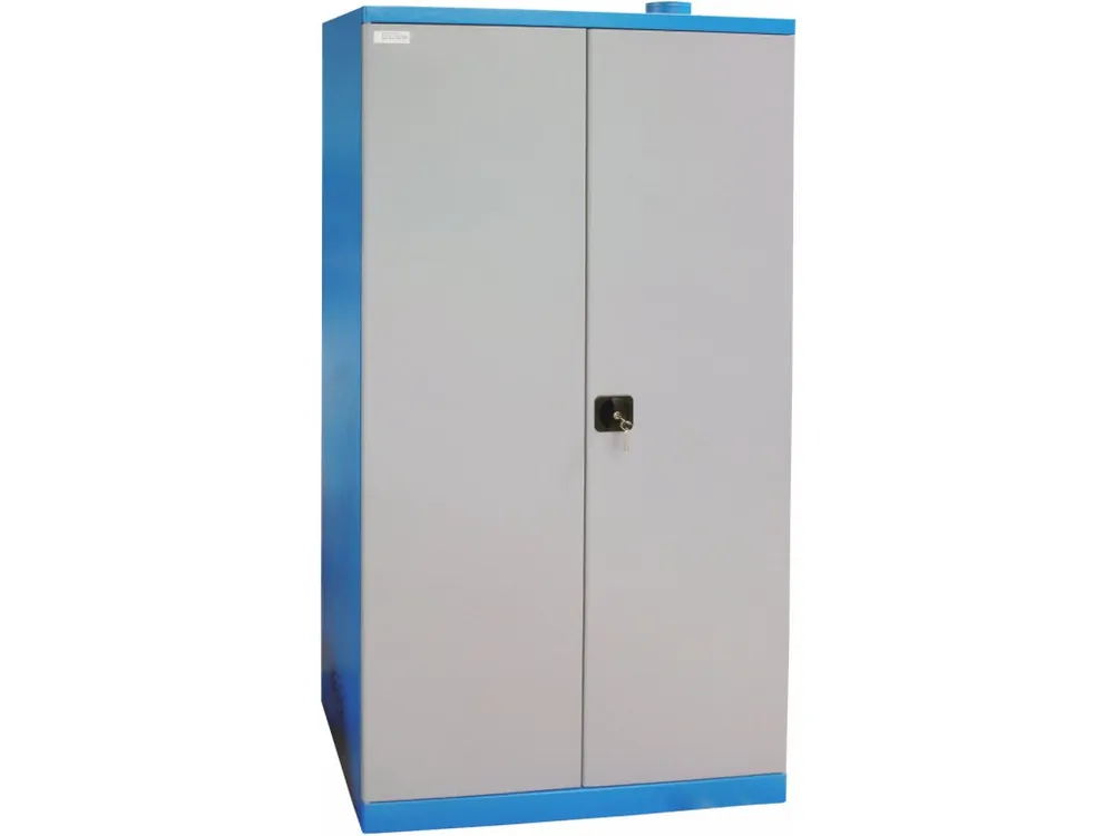 Dulap metalic, certificat pentru depozitarea în siguranță a substanțelor inflamabile sau otrăvitoare în condițiile atelierelor de service, instalațiilor de producție etc.Echipament: dulap cu două uși (blocare cu încuietoare cilindrică / ampatament – încuietoare dublă, 2 chei); 6 tăvi de tragere din tablă galvanizată (reglare opțională a înălțimii, capacitate de încărcare: 50 kg); sistem de ventilație a dulapului (grila de ventilație și coșul de fum).Constructie: cadru din otel cu plinta (l × w × h: 920 × 380 × 2.000 mm, margini rotunjite).Acoperire cu pulbere, culoare: RAL 5015 (corpus), RAL 7001 (ușă).Furnizat în stare asamblată.