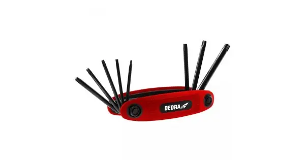 Material: otel CrV; Tip: TORX; Forma functionala a cutitului de buzunar; Dimensiuni incluse: T9/T10/T15/T20/T25/T27/T30/T40 CARACTERISTICI: Material: CrV Tip: Set – cheie hexagonala Serie: DEDRA Numarul este inclus: 8 Dimensiunea varfului: T9-T40