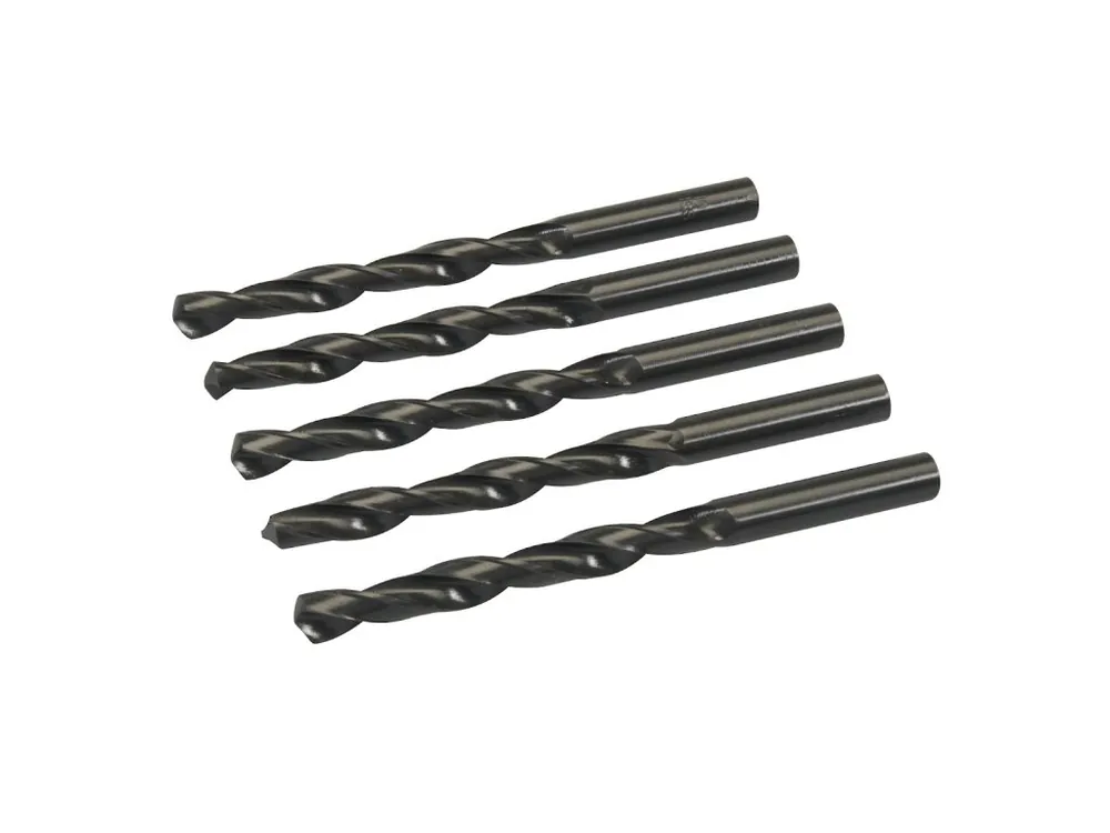 5 burghie DIN340, din oțel de mare viteză, cu un unghi de tăiere de 118°. Potrivit pentru găurirea oțelului, a metalelor neferoase, a materialelor plastice și a lemnului.