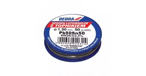 1,5mm, 50g, 50%SN, Pb50Sn50 CARACTERISTICI: Tip: Lipire prin flux Serie: DEDRA Diametru [mm]: 1.5 Greutate [g]: 50