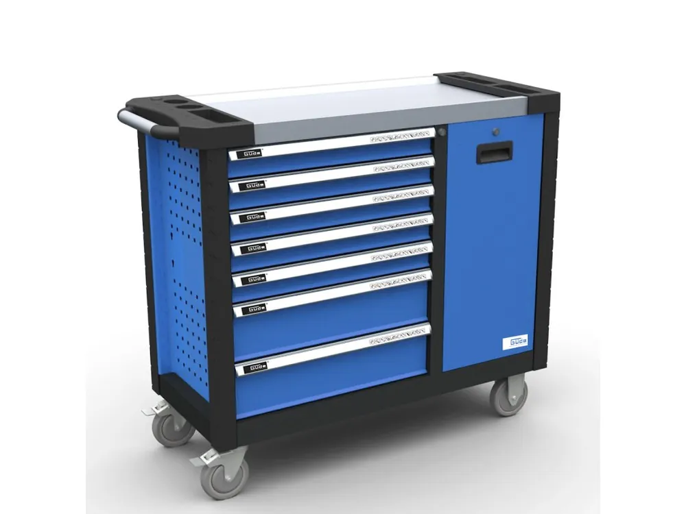 Cărucior profesional de asamblare, proiectat pentru transportul (depozitarea) uneltelor în spațiile atelierelor de service, instalațiilor de producție etc.7 sertare (dimensiuni w × d: 530 × 400 mm, înălțime: 5 × 60 mm; 2 × 135 mm; echipamente: șine telescopice de ghidare, siguranțe de siguranță împotriva extinderii spontane, diviziune internă cu fante pentru împărțirea spațiului prin separatoare, închidere centralizată cu încuietoare cilindrică).Dulap de blocare (dimensiuni w × d × h: 260 × 570 × 400 mm; echipament: siguranțe de siguranță împotriva ejecției spontane, încuietoare cilindru).Zona de depozitare superioară (din oțel inoxidabil) cu margini (compartimente) ridicate; pereți laterali perforați pentru fixarea parantezelor suspendate (sistem Q; găuri 1 cm2); marginile verticale ale căruciorului, inclusiv benzile de protecție împotriva deteriorării accidentale, de exemplu corpul vehiculului deservit; mâner de transport; roți de rulare din cauciuc (diametru: 150 mm, două ghidaje cu frână).Constructie: corp din tabla dubla de otel, piese metalice cu acoperire cu pulbere (design color: RAL 9005 – cadru, RAL 5015 – pereti/sertare).Furnizat în stare asamblată.