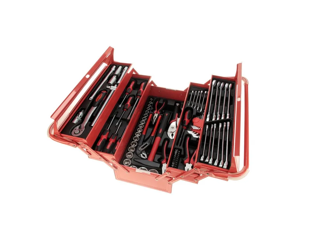 Tool case 86pcs Holzmann WZK 86CrV:20 x Sertare (8 – 32 mm)1 x Quastivo 300 g1 x Zăvor2 x 5 „, 10” atașamentBară glisantă de 1 x 10″1 x articulația Gimbal2 x socket (16 / 21mm)17 x Targa (6 – 22 mm)20 x biți cu suport (torx cu gaură (T10 – T50) și hex cu gaură (2 – 10 mm) )1 x mâner de biți șurubelniță8 x cheie cap Hex (1.5 – 10mm)Clești cu diagonală de 1 x 150 mm1 x Clești lungi 150mm1 x 180mm combi1 x Handy 240mm1 x clește de 250 mm6 x Șurubelniță (canelură: 3 x 75, 4 x 100, 6 x 10, 8 x 150 / Phillips PH 1 x 80, PH 2 x 100mm)1 x Carcasă metalicăGreutate 16 kgDimensiuni pachet 530 x 235 x 245 mm