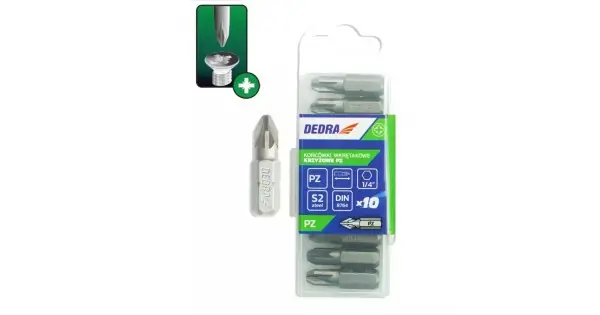 10 bucati, cutie de plastic CARACTERISTICI: Tip: Biti, bucati de surubelnita Serie: DEDRA Numarul este inclus: 10 Tip maner: HEX Tip de bacsis: Pozidriv (PZ) Lungime bit [mm]: 25