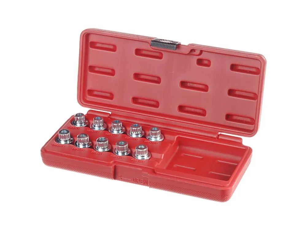 Concepute pentru instalarea şi demontarea şuruburilor şi piuliţelor de siguranţă ale roţilor de la vehiculele BMW. Dimensiuni cheie: 30/13PT, 31/15PT, 32/16PT, 33/17PT, 34/18PT, 35/19PT, 36/20PT, 37/21PT, 38/22PT, 40/23PT, înălţime cheie 25 mm. Hexagonală 17 mm. Livrat aranjat ordonat într-o trusă din plastic.