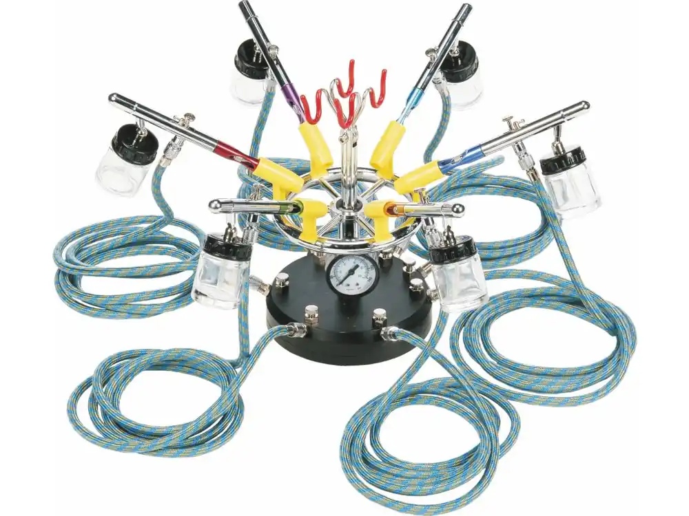 Setul de 6 buc. de pistoale pentru airbrush permite schimbarea operativă a 6 culori în timpul aplicării, ceea ce măreşte eficacitatea muncii. Parte componentă a setului în geanta cu pistoale şi vase pentru vopsea (capacitate 20 ml) este şi suportul rotativ masiv pentru accesul şi prinderea uşoară a 7 buc. de furtunuri de aer. În suport este integrat ştuţul de intrare împreună cu manometrul pentru controlul presiunii şi 6 ştuţuri pentru racordarea pistoalelor în parte. Diametrul duzei 0,35 mm, presiunea de lucru 4 bari, racord 1/8 sau 1/4″(reducţie).