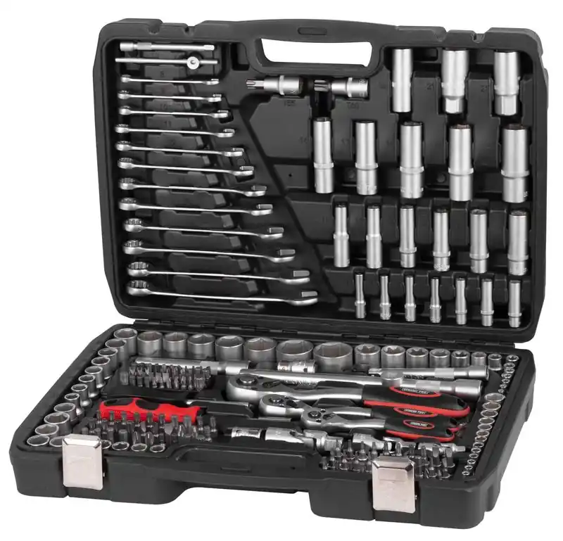 O parte indispensabilă a atelierului este setul de scule Strend Pro de 215 piese de înaltă calitate, depozitat într-o cutie practică, în care fiecare piesă are propriul loc de depozitare, deci nu există pericolul că vei avea mizerie în el. Conține următoarele instrumente: