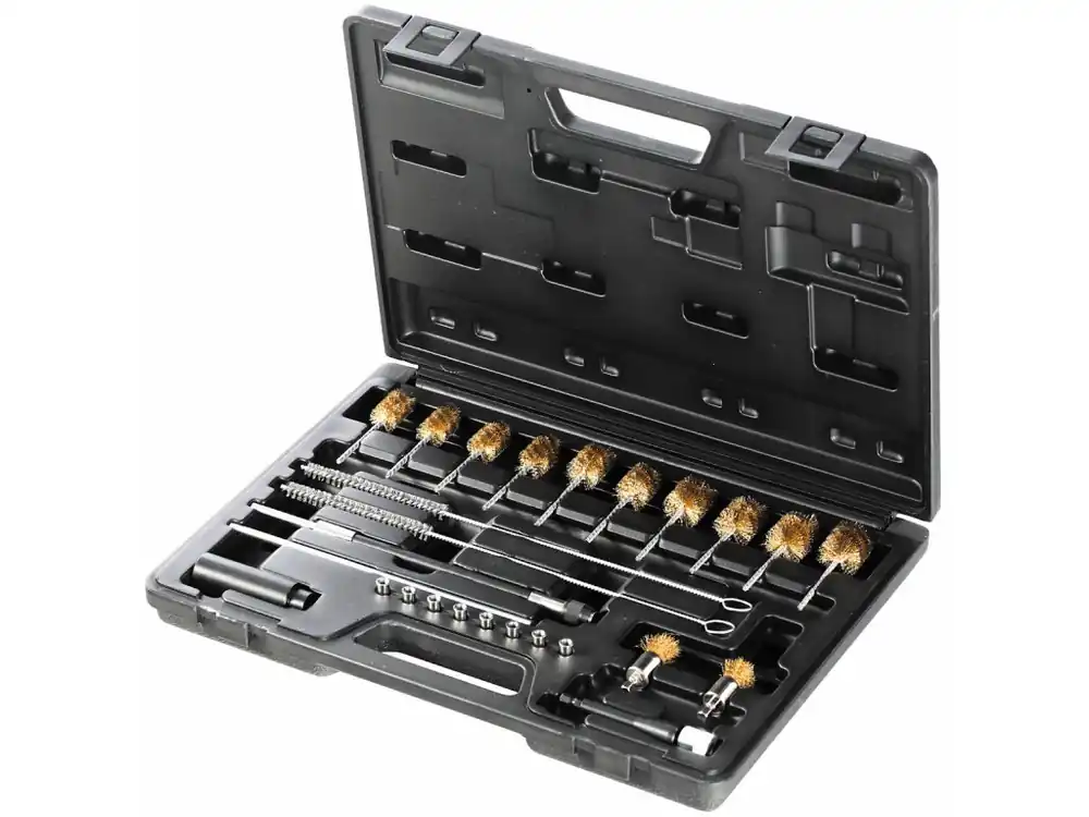 Setul conţine perii de sârmă din alamă Ø 18; 19; 21; 24; 26 mm, perii de sârmă din oţel lungime 300 mm Ø 9 şi 10 mm, perii conice, suporţi şi adaptoare de perie. Utilizare: pentru curăţarea sedimentelor de carbon de la injectoarele motorului şi pentru curăţarea scaunelor injectoarelor. Livrat într-o geantă din plastic.