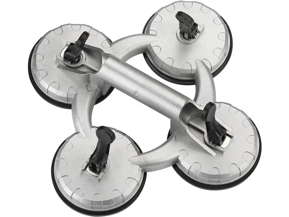 O ventuză cu patru braţe stabilă; o sculă practică pentru transportarea şi manevrarea unor materiale curate, uscate şi neporoase, cum ar fi: gresie/faianţă, marmură, granit, sticlă, metale, materiale plastice, linoleum, fibră de sticlă etc. Confecţionată din aliaj de Al, suprafaţa nichelată, diametrul ventuzei 123 mm, capacitate portantă 100 kg.