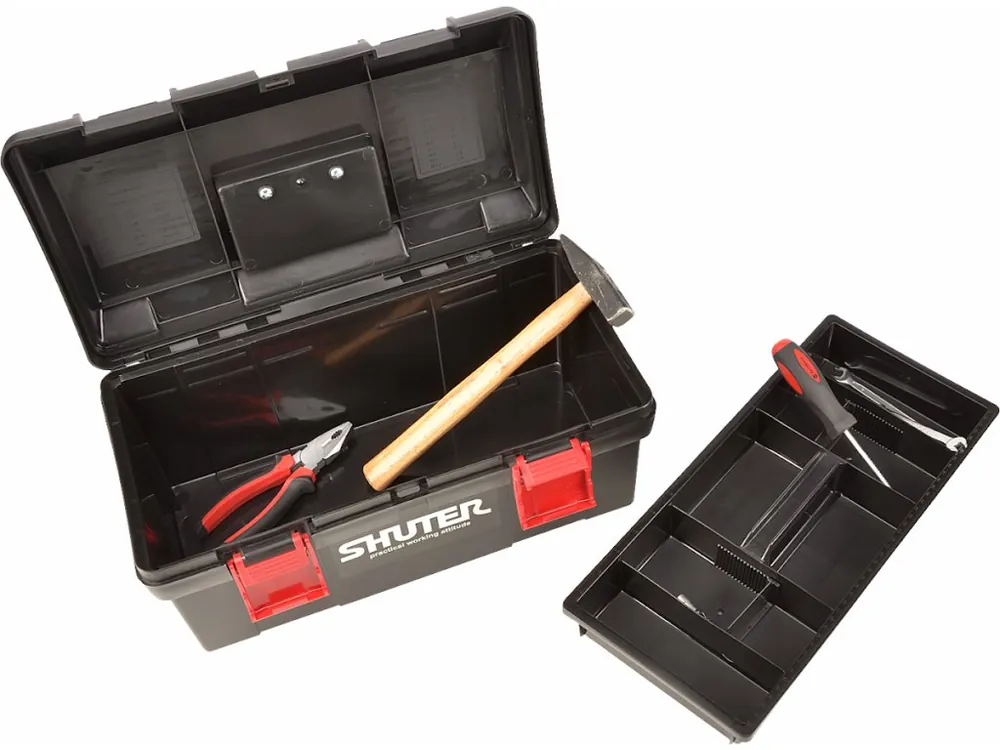 Geantă compactă pentru scule de la renumitul brand SHUTER, fabricată din polipropilenă de calitate, ideală pentru depozitarea și transportul ordonat al sculelor și pieselor mici. Interiorul este echipat cu un raft detașabil, care facilitează organizarea elementelor mai mici. Mânerul rabatabil încastrat asigură transportul confortabil, iar clemele din plastic garantează închiderea sigură. Datorită greutății reduse și construcției rezistente, geanta este potrivită atât pentru profesioniști, cât și pentru pasionații de bricolaj.