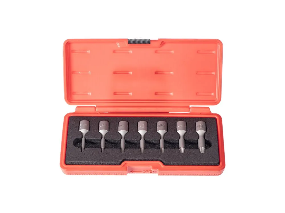 Set biți pentru slăbirea șuruburilor deteriorate cu capul IMBUS 2, 3, 4, 5, 6, 8 și 10 mm. Profilul conic cu canelare spre stânga permite slăbirea șuruburilor cu hexagonul interior deteriorat. Destinat setului de tubulare 3/8″, execuție din oțel CrMo. Ambalare sinoptică în carcasă din plastic.