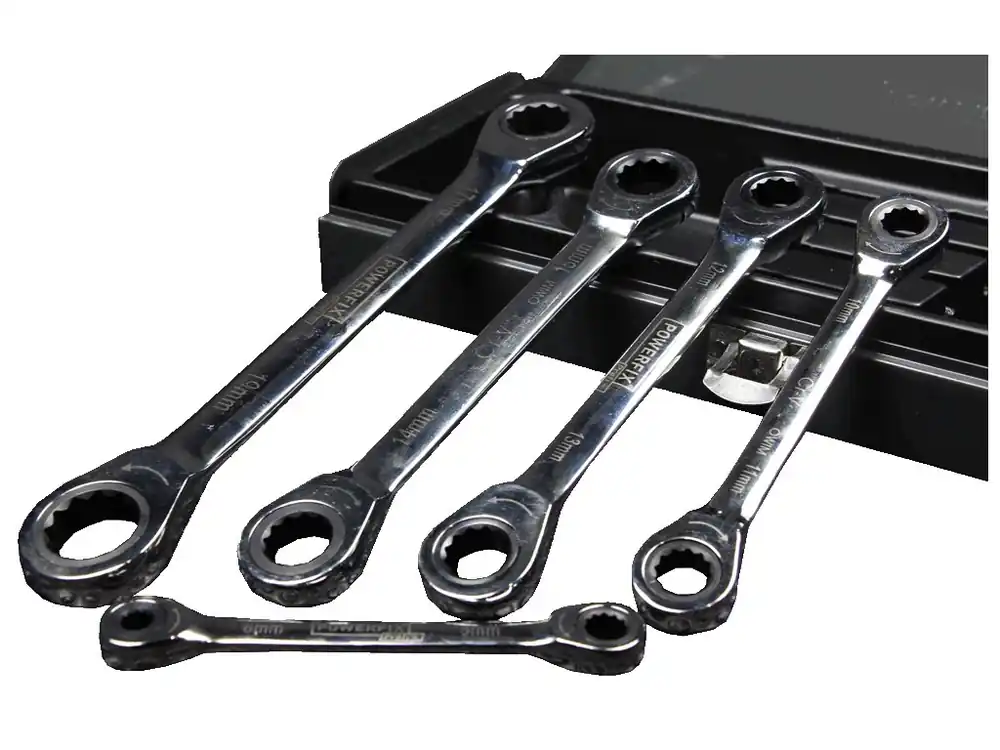 Cheie dublă cu clichet, faţă din oţel cromat. Dimensiuni ale cheii: 6 × 8; 10 × 11; 12 × 13; 14 × 15 şi 17 × 19 mm, 72 de dinţi, rotire la stânga şi la dreapta. Aranjat într-o geantă.