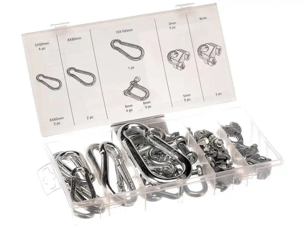 Conține: carabine – 5 × 50 mm/4 buc. 6 × 60 mm/3 buc. 10 × 100 mm/1 buc. Cleme D – 6 mm/4 buc. 8 mm/3 buc. Cleme de cablu – 3 mm/5 buc. 5 mm/5 buc. 8 mm – 3 buc. Material: oțel carbon, păstrate în cutie din plastic.