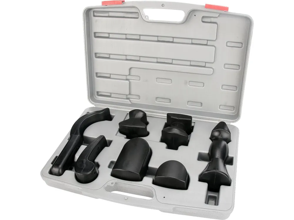 Setul în geantă de plastic conţine 7 buc. de nicovale de tinichigerie din cauciuc dur. Diferite forme şi mărimi sunt selectate în aşa fel încât să satisfacă la maximum nevoilor la îndreptarea caroseriei defecte.
