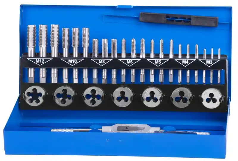 Contine: – 21 buc robinete: M3, M4, M5, M6, M8, M10, M12 – 7 buc ochi filetati: M3, M4, M5, M6, M8, M10, M12 – 1 buc retur pentru robinete: M3-M12 – 1 buc returner pentru ochi filetati: 25 mm O/D – 1 șurubelniță buc