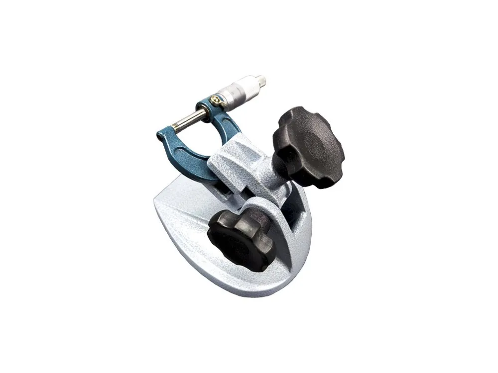 Un dispozitiv practic şi indispensabil de înlocuire a „celei de-a treia mâini” atât de necesare pentru a ţine micrometrul atunci când măsuraţi. Dimensiuni de bază: 158 × 113 mm. Lăţime max. de deschidere: 18 mm. Conceput pentru micrometre cu o lungime de 100 mm. Material: aliaj de aluminiu.
