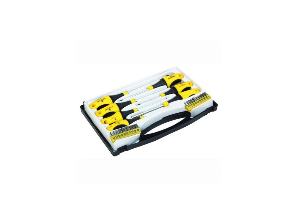 Set șurubelniță cu biți de 27buc- oțel aliat S2- terminal magnetic- Maner ergonomic cu doua componente inmuiateKit-ul include:- 3x șurubelniță plană- 3x șurubelniță Phillips- 1x racleta cu bucati- 20x bițiUn set de șurubelnițe cu biți oferă cea mai înaltă calitate.Toate piesele sunt realizate din oțel cromvanadiu.