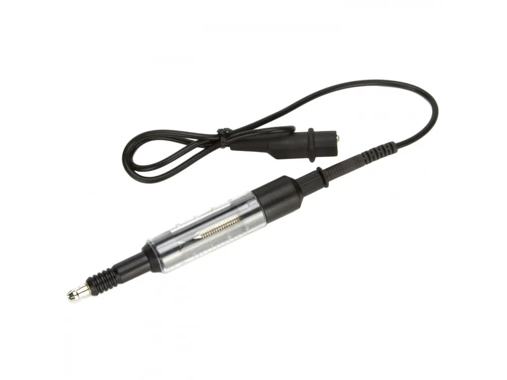 Scânteietor cu distanţa reglabilă, pentru testarea sistemului de aprindere (0 – 40 000 V) Conectaţi aparatul pe cablul în locul bujiei, iar cel de-al doilea cablu la masă. Cu ajutorul şurubului reglaţi distanţa între electrozi şi simulaţi astfel capacitatea de sărire a scânteii. Distanţa de sărire este mai mare decât în cilindru deoarece testul este efectuat la presiunea atmosferică.