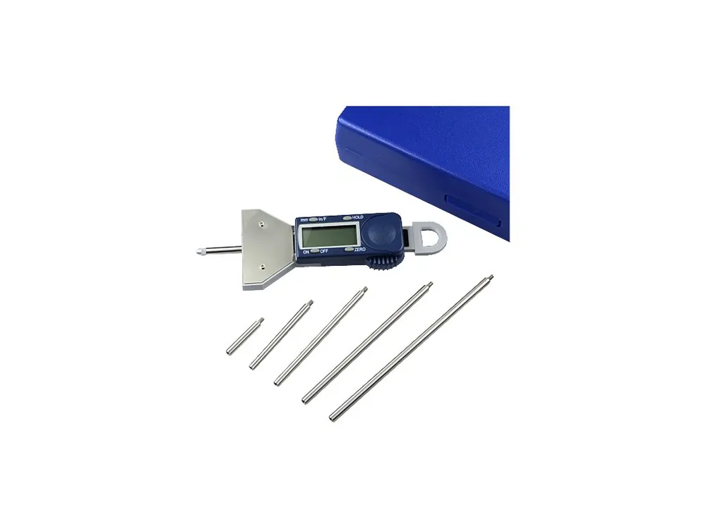 Indicator de adâncime cu un interval mare de măsurare. Afişaj cu patru cifre uşor de citit. Accesorii înfiletabile care permit atingerea unei adâncimi de până la 550 mm. diviziuni de 0,01 mm. Măsurare în mm şi ţoli. cursă de 25 mm. 5 accesorii. Livrat într-o cutie din plastic.