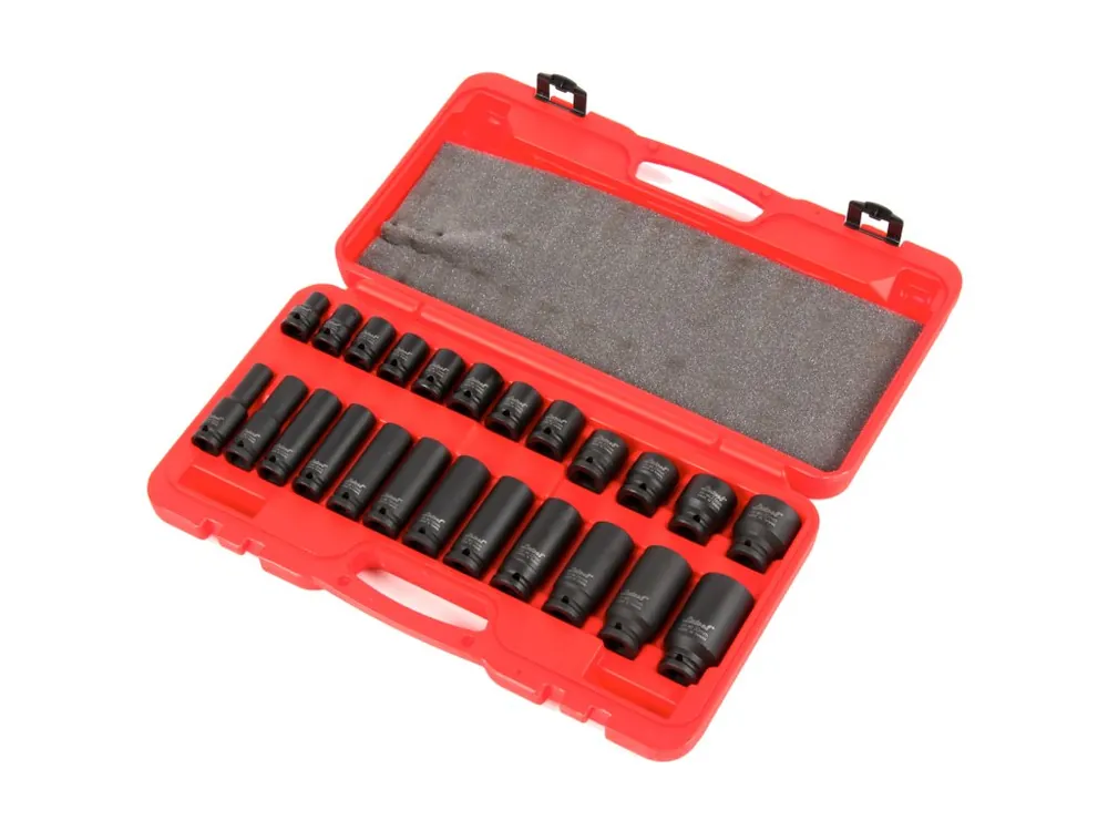 Două seturi de biți scurți și prelungiți de mărimile 10, 13, 15, 16, 17, 18, 19, 21, 22, 24, 27 și 30 mm cu conectare la antrenor cu clichet și mașini de strângere cu impact de 1/2″. Cheilesunt depuse sinoptic în geantă din plastic.