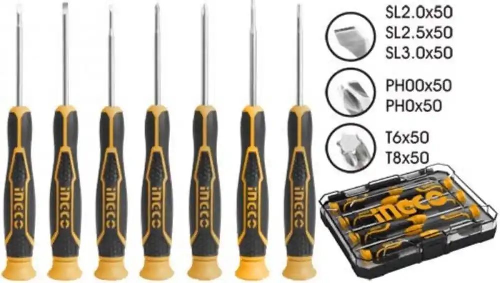 set de șurubelnițe fine 7 buc din oțel crom-vanadiu, mâner ergonomic cu proprietăți antiderapante Design INGCO, cutie din plastic SL2.0 * 50SL2.5 * 50SL3.0 * 50PH00 * 50PH0 * 50T6 * 50T8 * 50